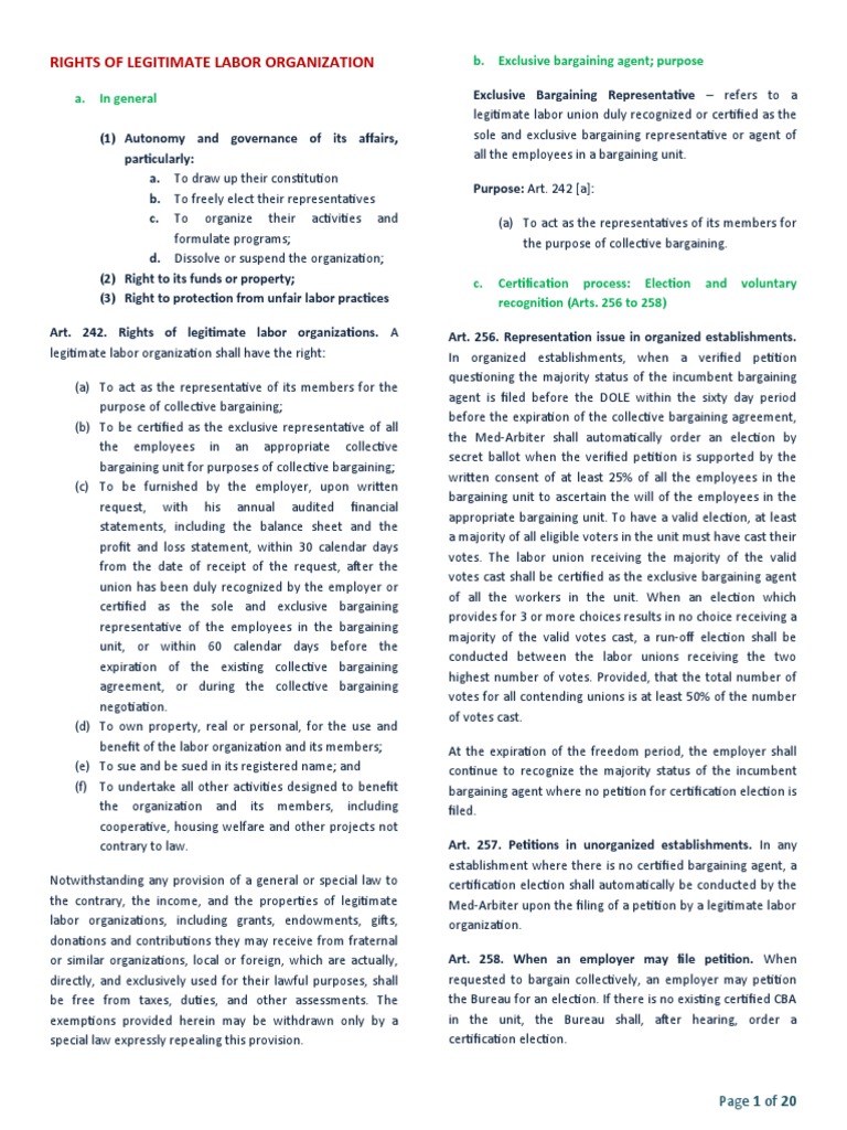 Rights of Legitimate Labor Organization: B. Exclusive Bargaining Agent Purpose