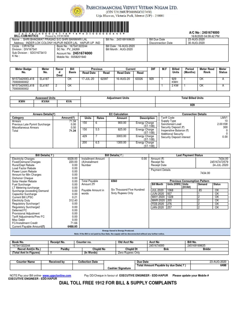 Name : SHRI BHAGWAT PRASAD S/O SHRI BANWARI LAL Bill No : 245169169635 Bill Due Date 23-AUG-2020