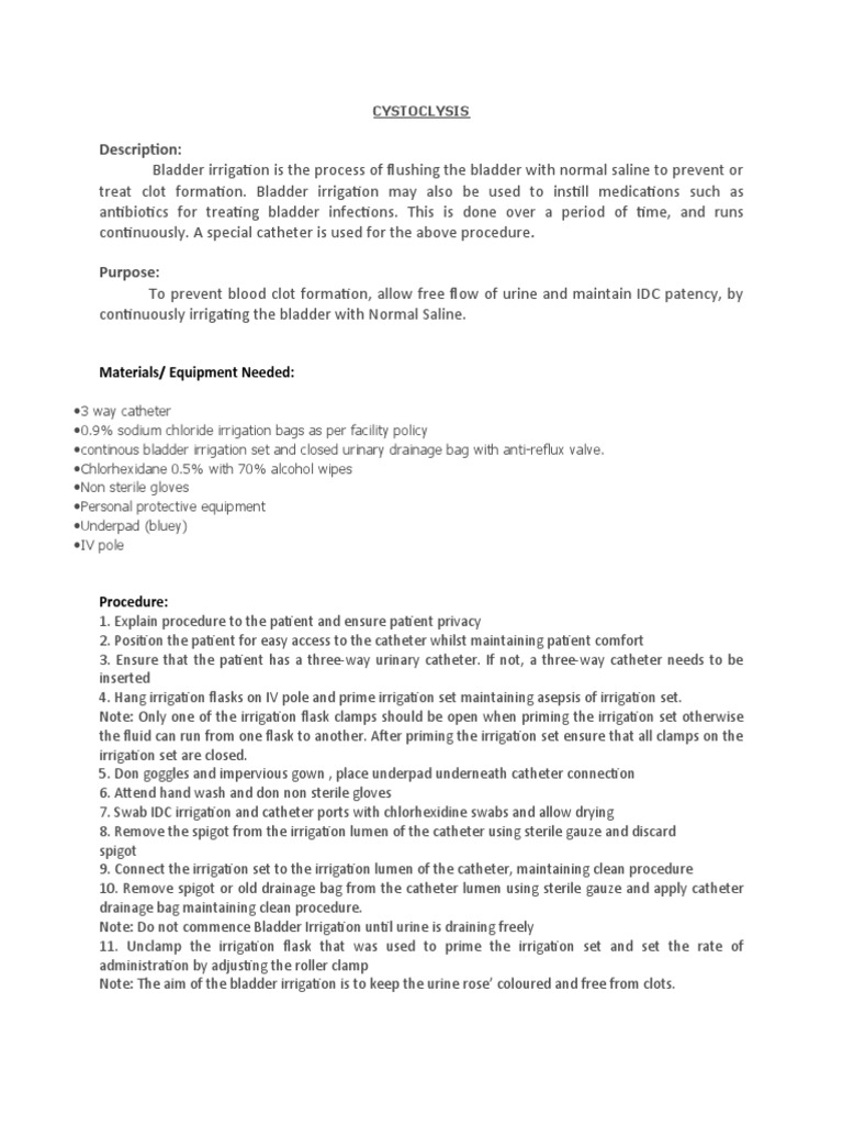 Bladder irrigation is the process of flushing the bladder with normal saline to prevent or