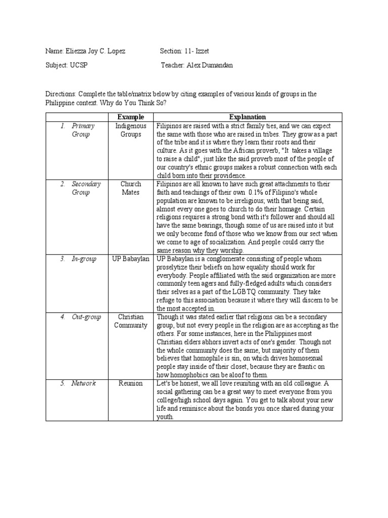 Directions: Complete the table/matrix below by citing examples of various kinds of groups in the