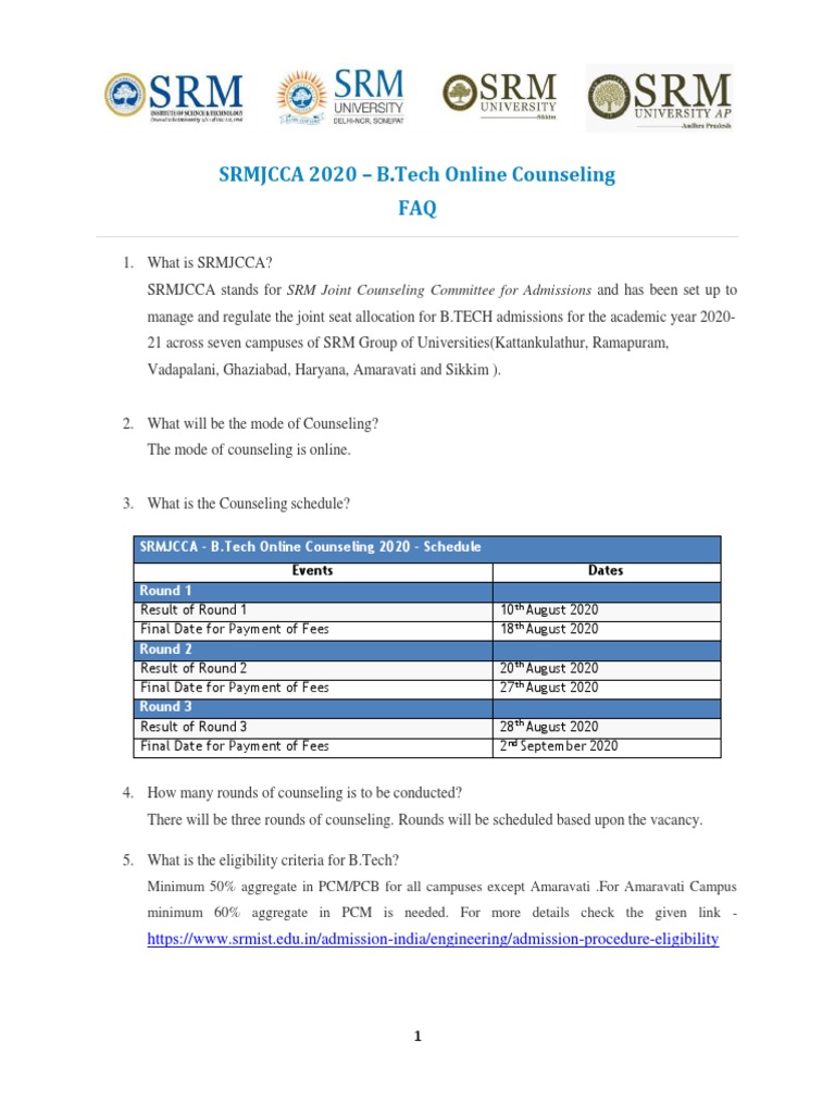 SRMJCCA - B.Tech Online Counseling 2020 - Schedule