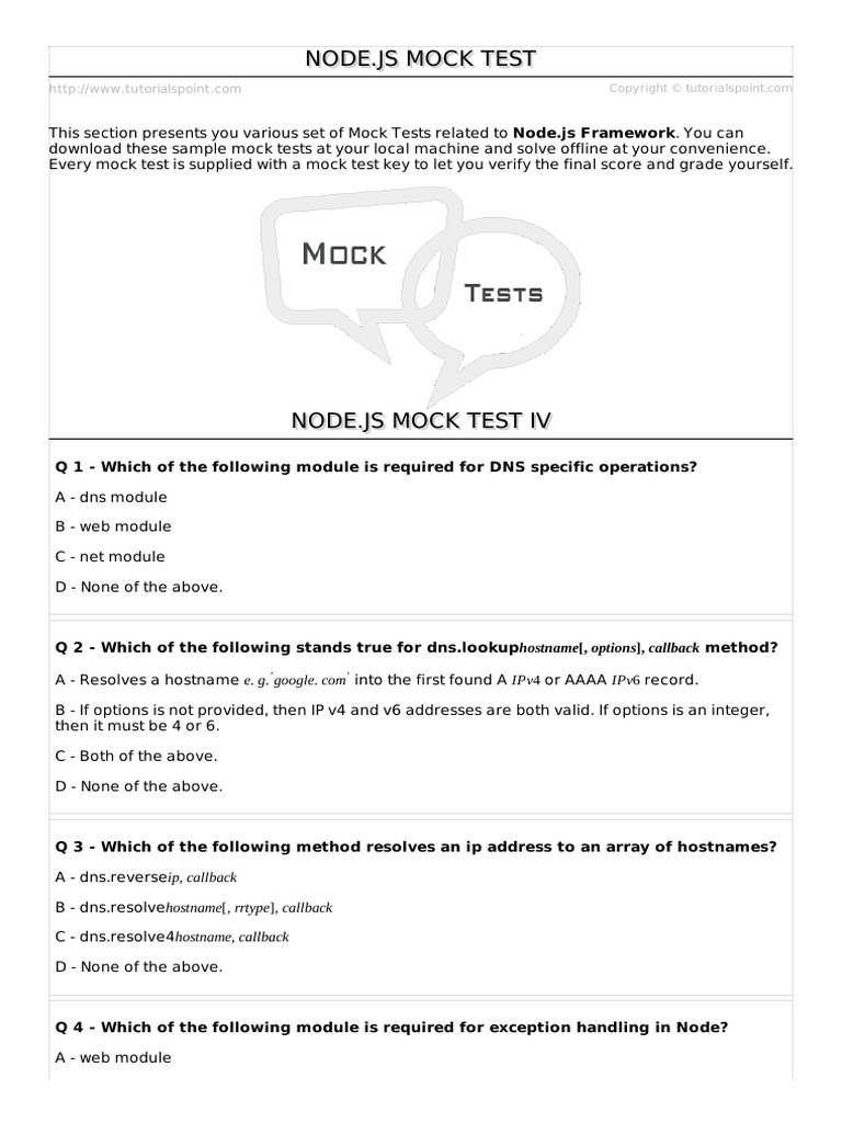 This section presents you various set of Mock Tests related to Node.js Framework. You can