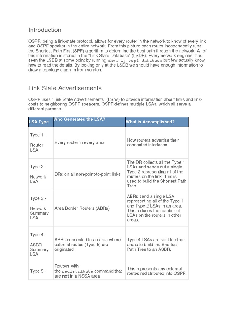 costs to neighboring OSPF speakers. OSPF defines multiple LSAs, which all serve a