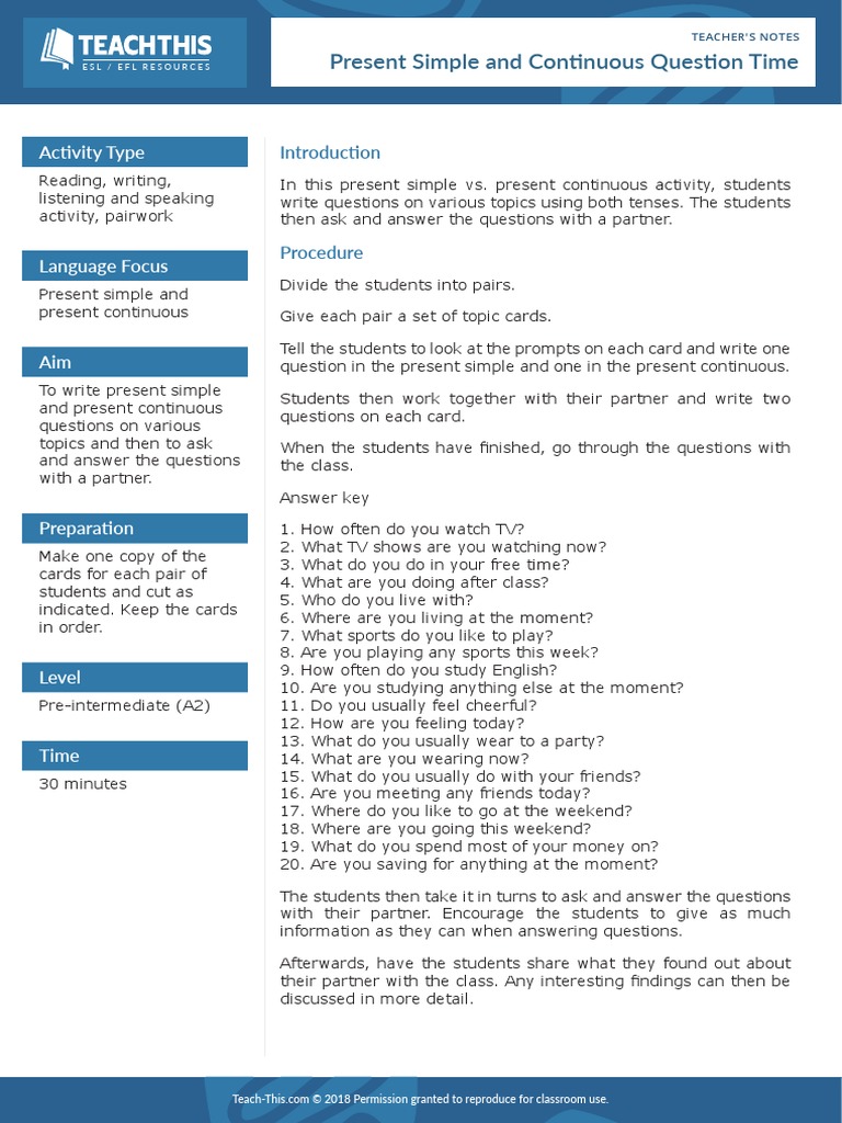 ESL / EFL RESOURCES Present Simple and Continuous Question Time