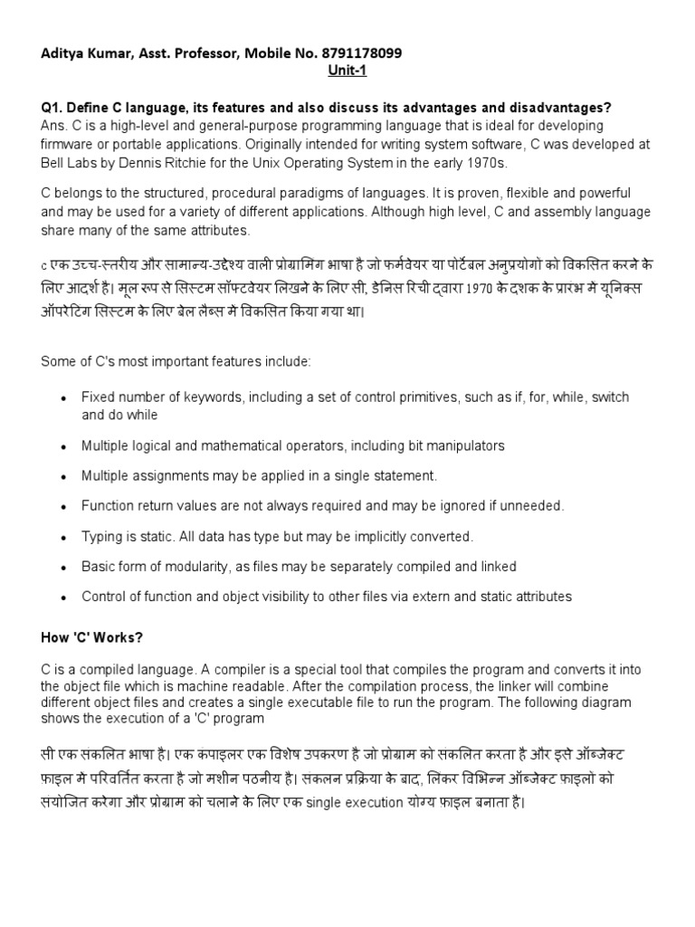 Q1. Define C language, its features and also discuss its advantages and disadvantages?