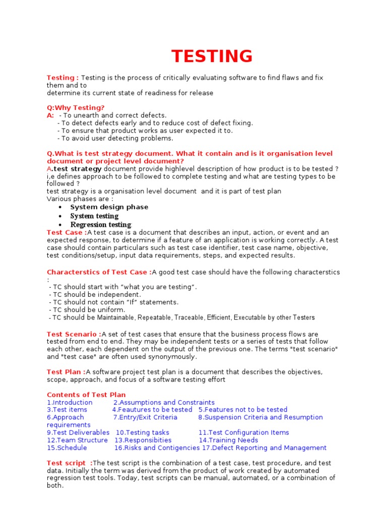 Testing : Testing is the process of critically evaluating software to find flaws and fix