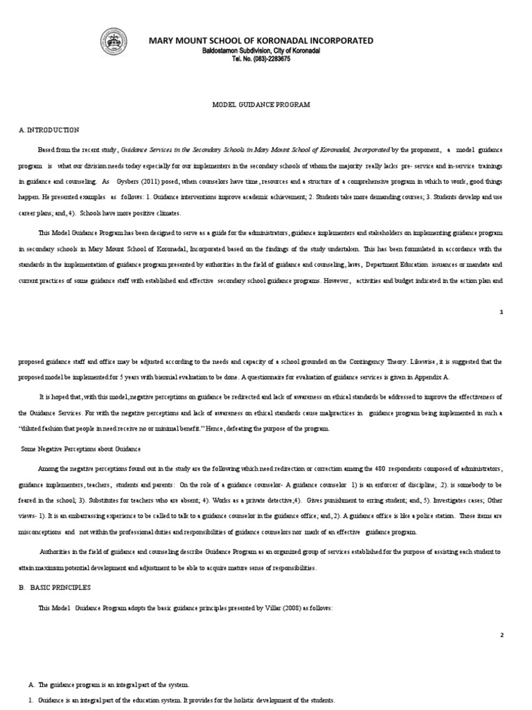 Based from the recent study, Guidance Services in the Secondary Schools in Mary Mount School of Koronadal, Incorporated by the proponent, a model guidance