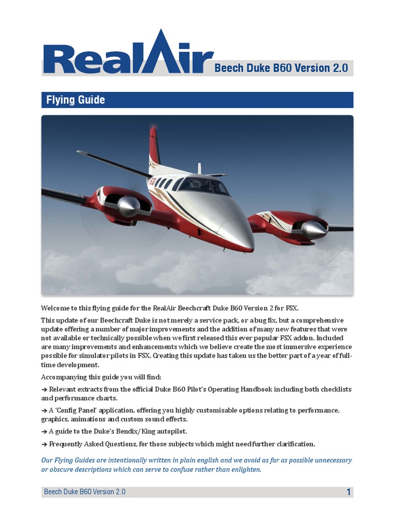 Welcome to this flying guide for the RealAir Beechcraft Duke B60 Version 2 for FSX.