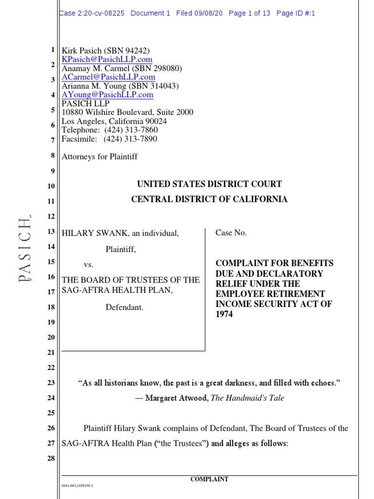 26 Plaintiff Hilary Swank complains of Defendant, The Board of Trustees of the