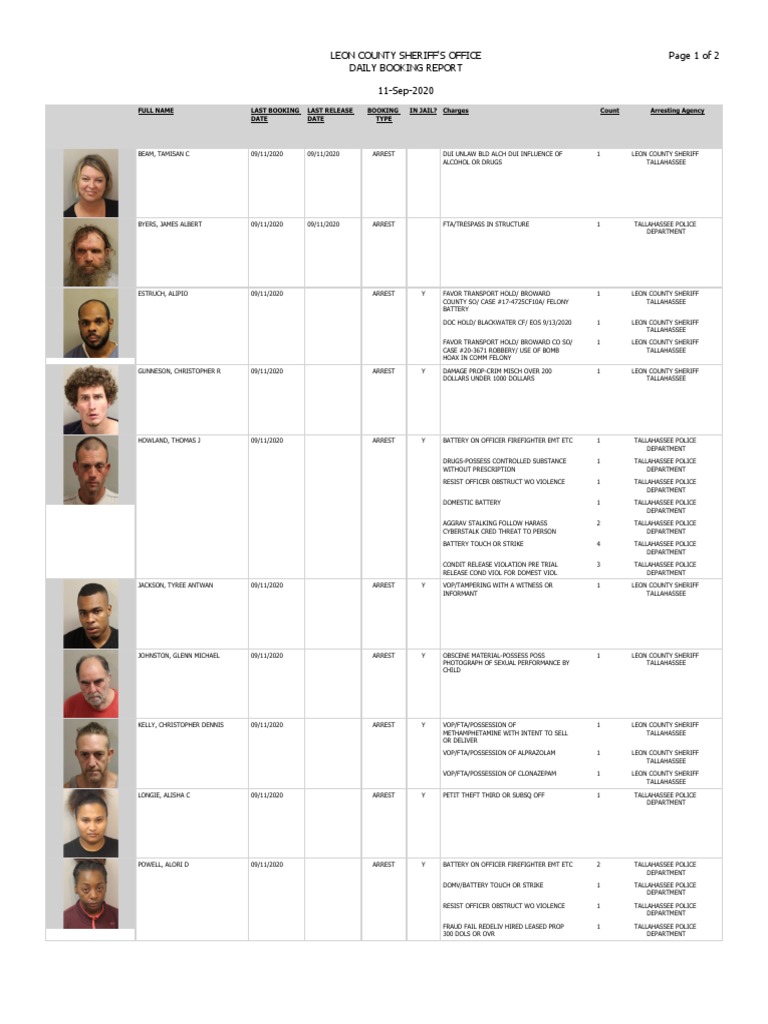 BYERS, JAMES ALBERT 09/11/2020 09/11/2020 ARREST FTA/TRESPASS IN STRUCTURE 1 TALLAHASSEE POLICE