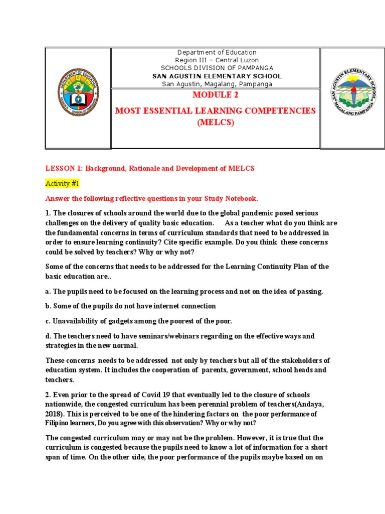 ACTIVITY 3: K-12 CURRICULUM GUIDE AND CORRESPONDING LIST OF MELCs