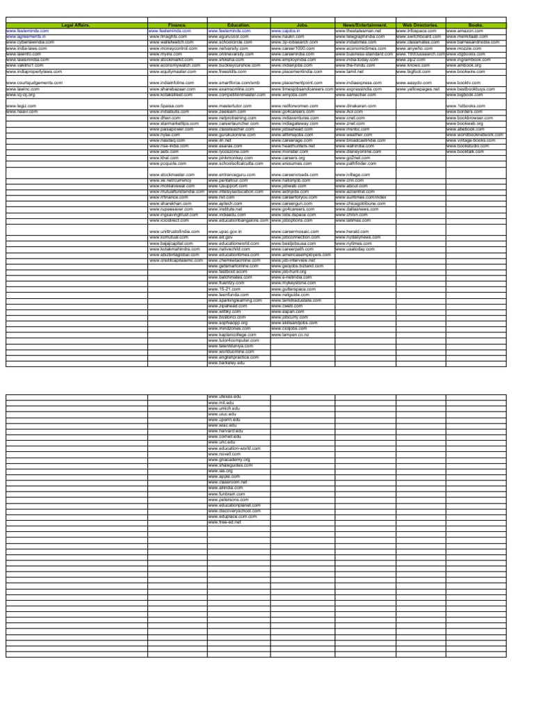Legal Affairs. Finance. Education. Jobs. News/Entertainment. Web Directories. Books