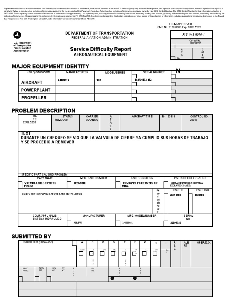 Paperwork Reduction Act Burden Statement: This form reports occurrences or detection of each failure, malfunction, or defect in an aircraft.