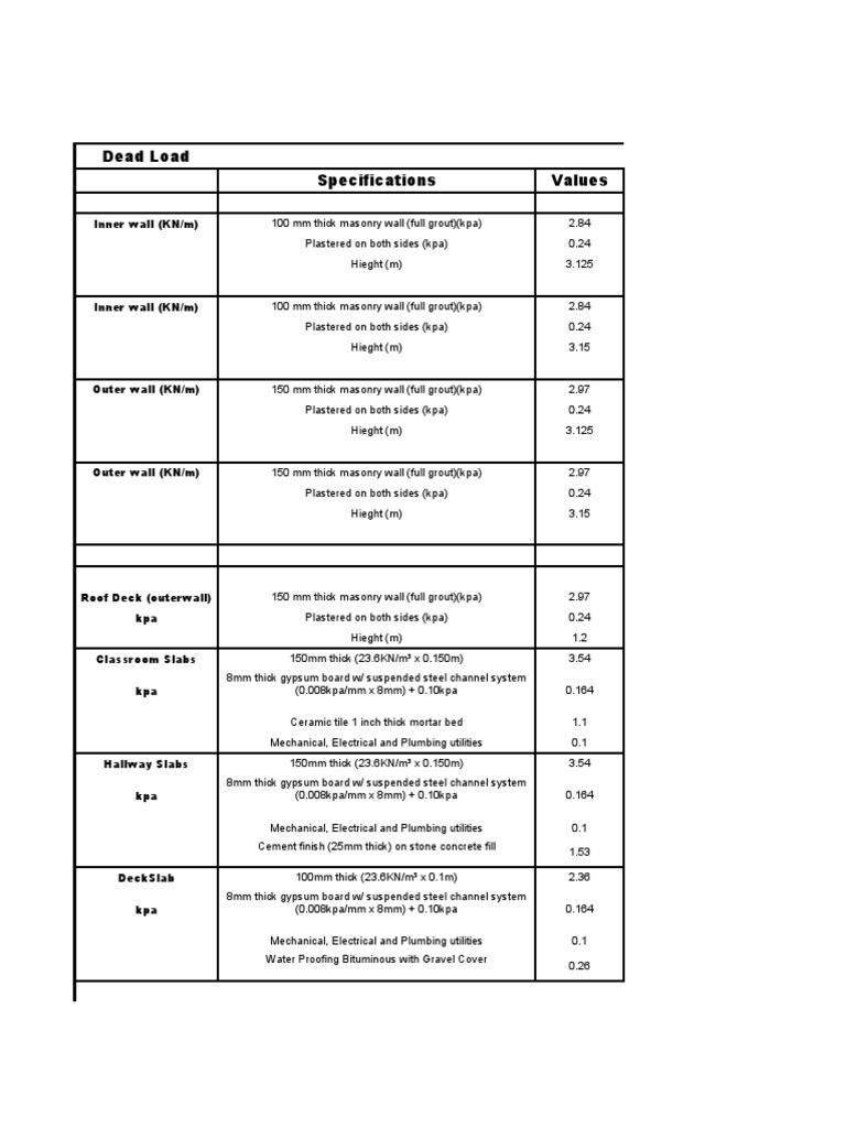 Outer wall (KN/m) 150 mm thick masonry wall (full grout)(kpa) 2.97