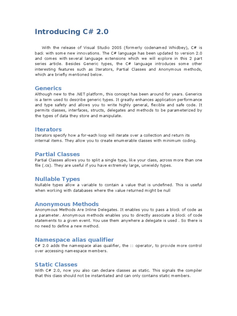 In this article, we explored the various new features introduced in C# 2.0. In Part