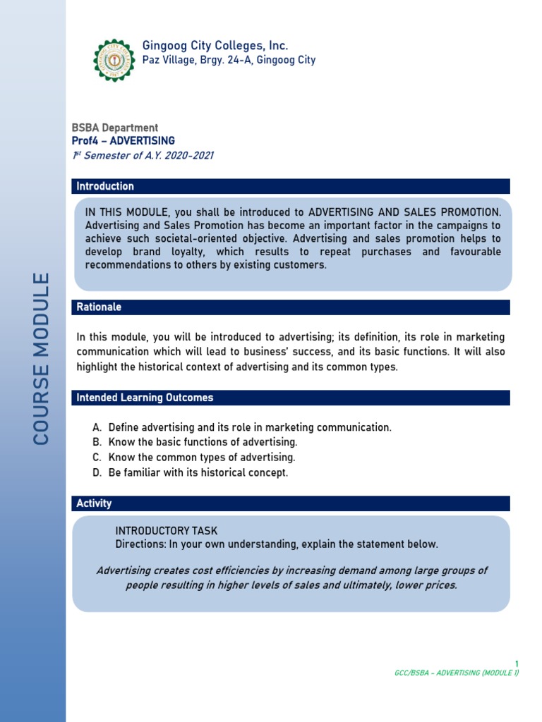 GCC/BSBA – ADVERTISING (MODULE 1)