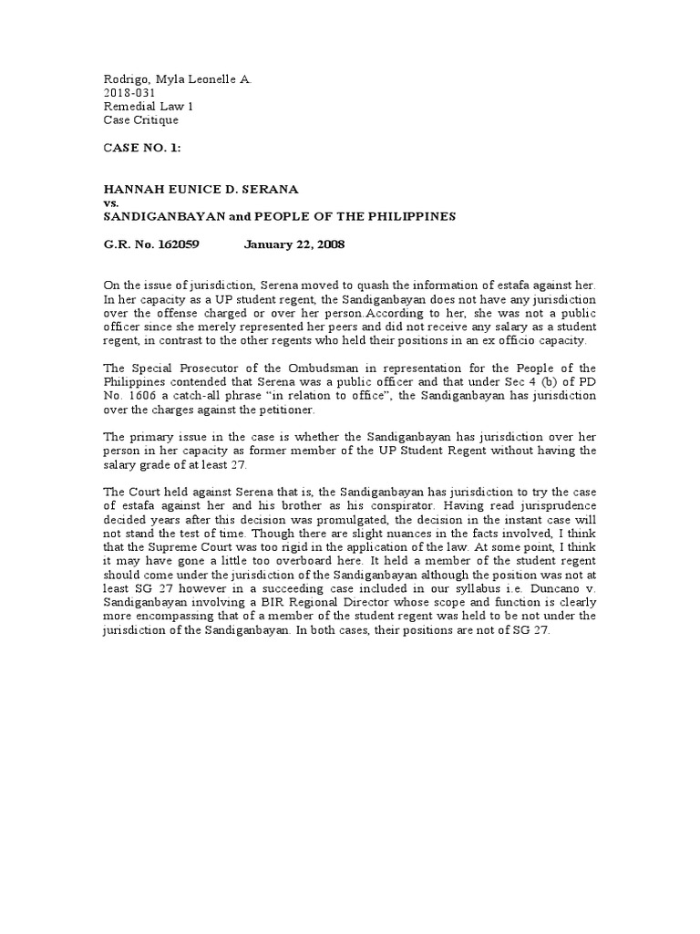 On the issue of jurisdiction, Serena moved to quash the information of estafa against her.