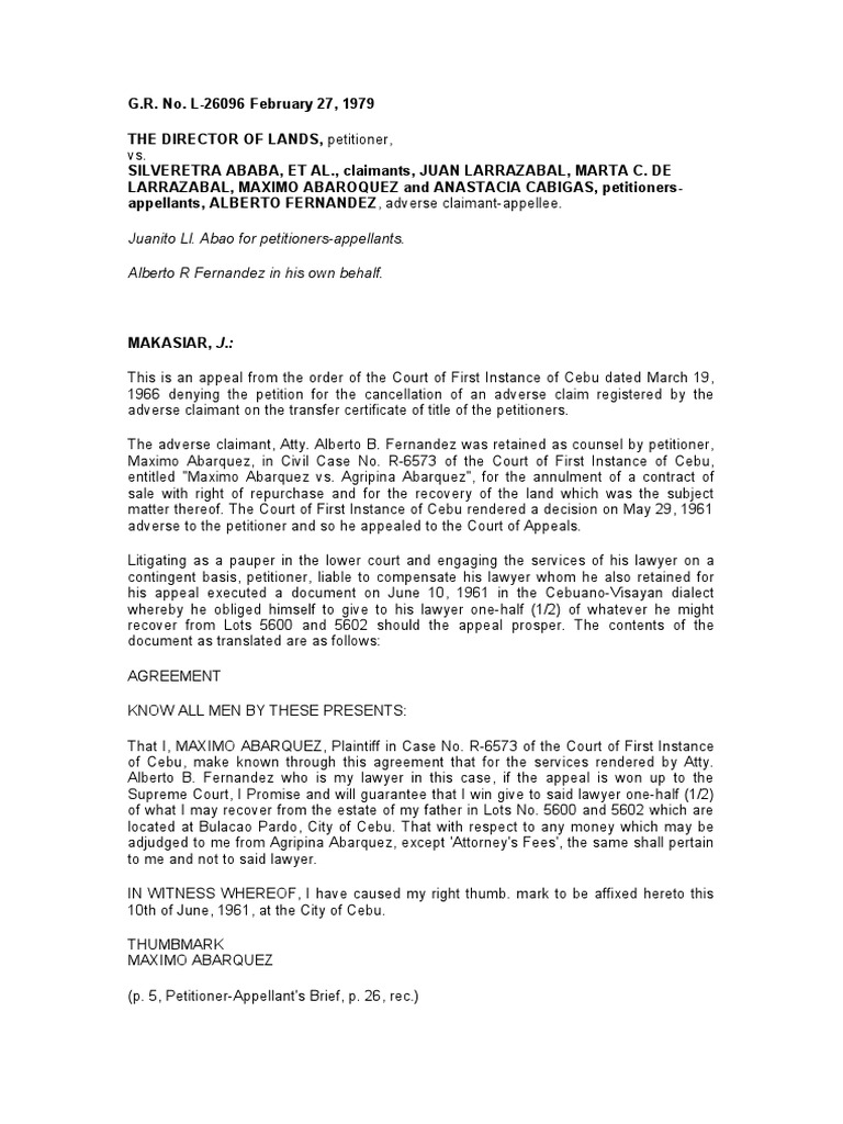 of his client, Maximo Abarquez. And, the compensation of one-half of the lots in question