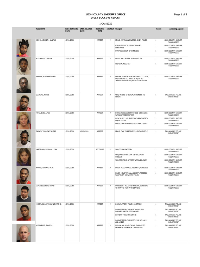 ADAMS, KENNETH SANTOS 10/01/2020 ARREST Y FRAUD-IMPERSON FALSE ID GIVEN TO LEO 1 LEON COUNTY SHERIFF