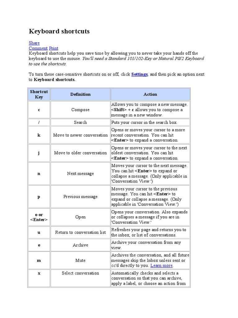 Combo-keys - Use the following combinations of keys to navigate through Gmail.