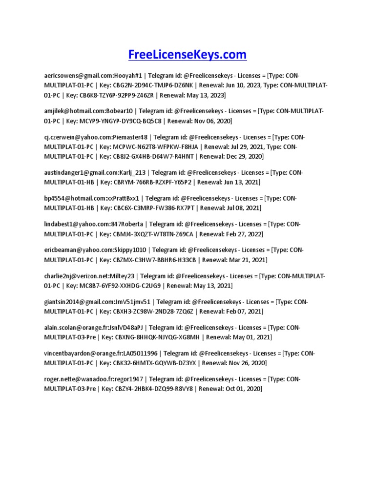 ericbeaman@yahoo.com:Skippy1010 | Telegram id: @Freelicensekeys - Licenses = [Type: CON-