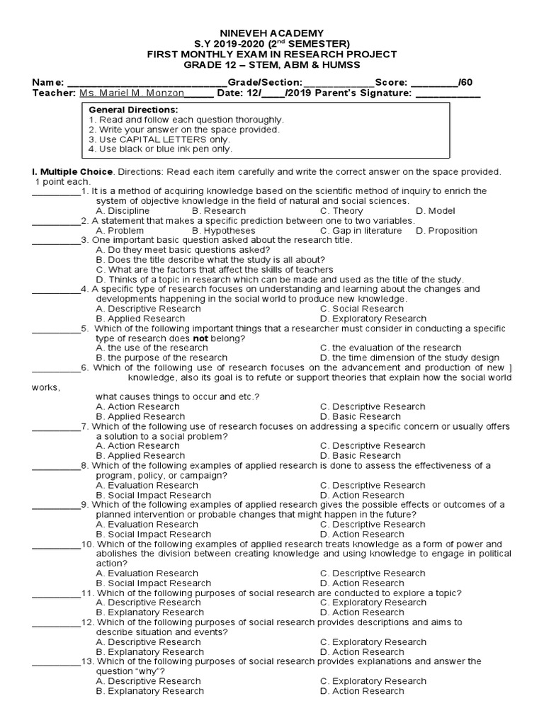 FIRST MONTHLY EXAM IN RESEARCH PROJECT
