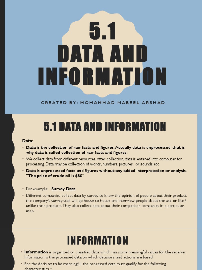 • Data is a single unit. A group of data which carries news and meaning is called Information.