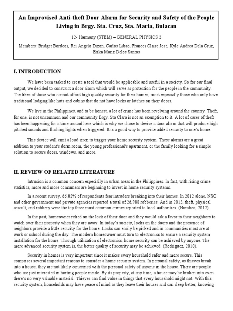 output, we decided to construct a door alarm which will serve as protection for the people in the community.