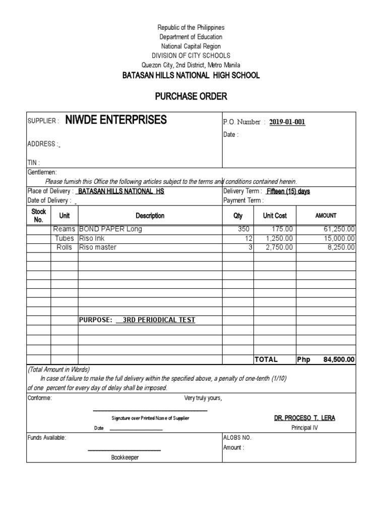 address to the “Chairman, Procurement Committee, Batasan Hills National High School,