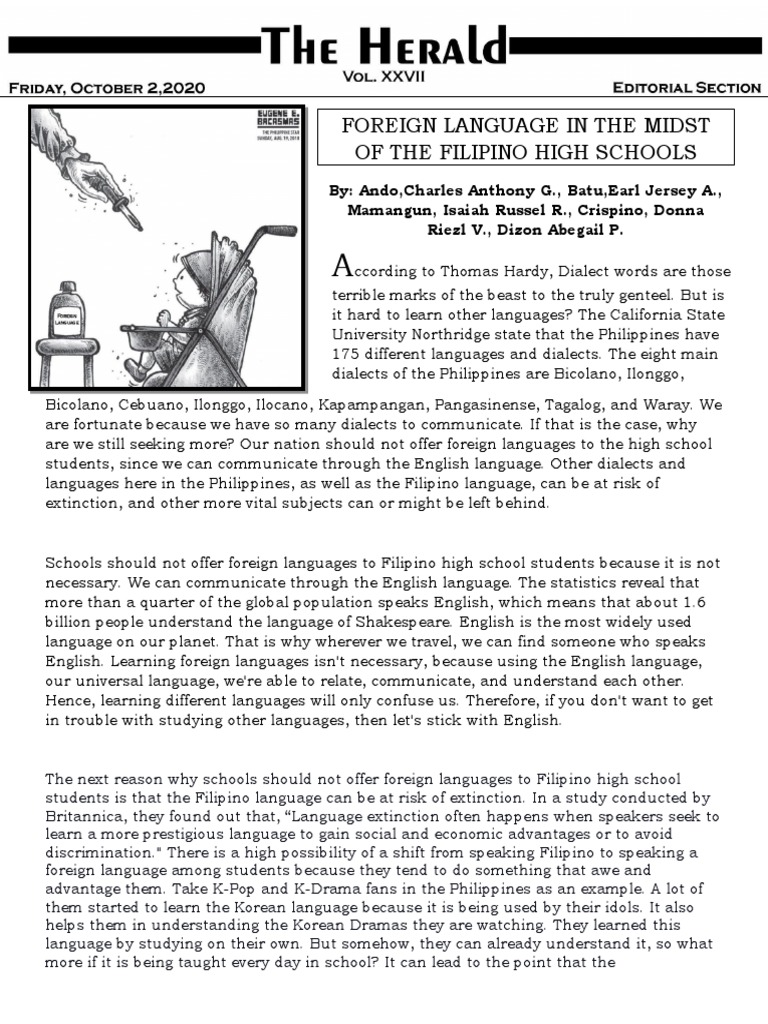 Schools should not offer foreign languages to Filipino high school students because it is not
