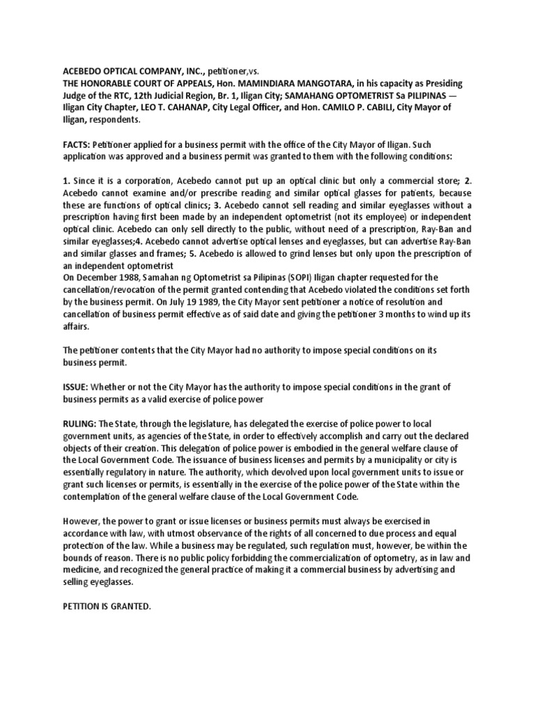 1. Since it is a corporation, Acebedo cannot put up an optical clinic but only a commercial store; 2.