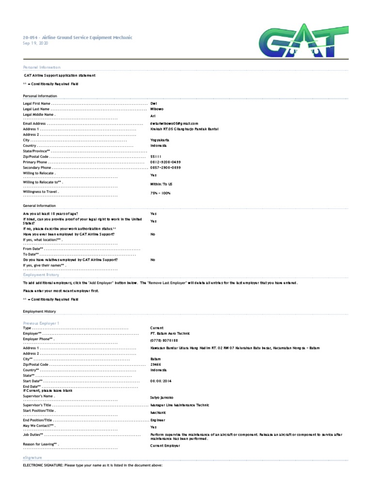 Employer** . . . . . . . . . . . . . . . . . . . . . . . . . . . . . . . . . . . . . . . . . . . . . . . . . . . . . . PT. Batam Aero Technic