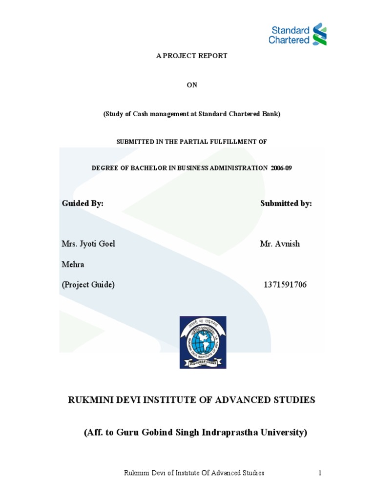 cash management at Standard Chartered Bank done by Mr. Avnish Mehra, Roll No.