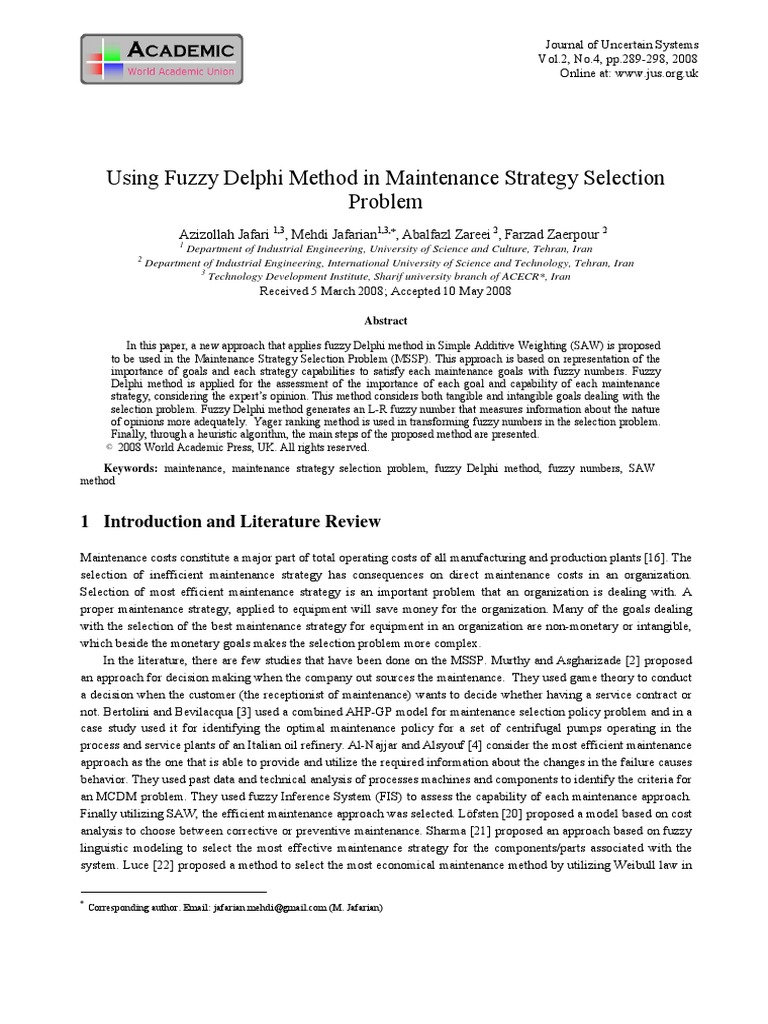 298 A. Jafari et al.: Using Fuzzy Delphi Method in Maintenance Strategy Selection Problem
