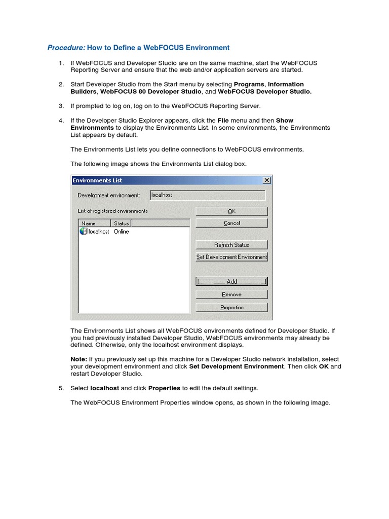 The Environments List shows all WebFOCUS environments defined for Developer Studio. If