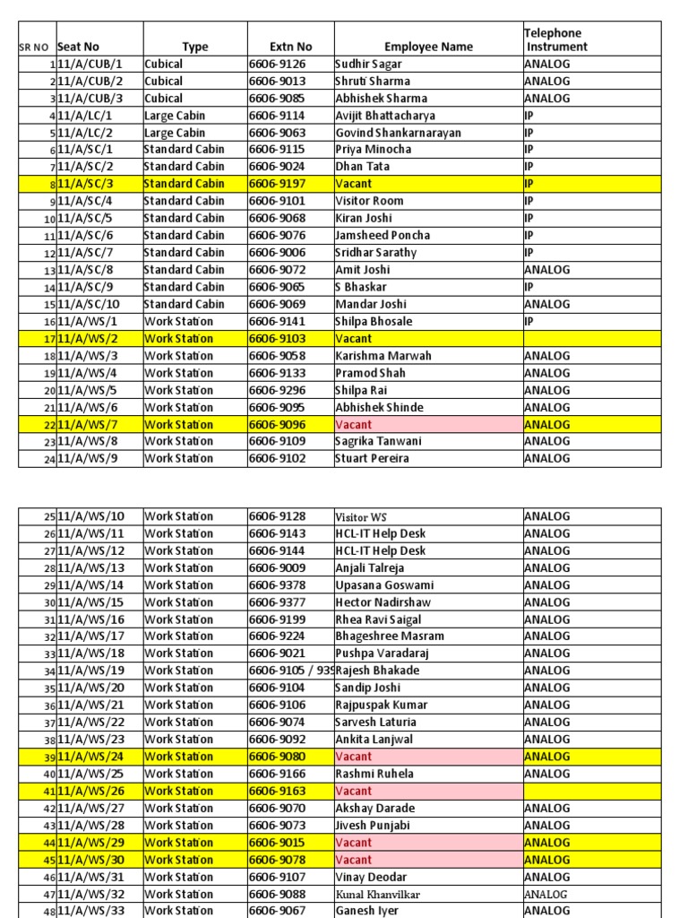 Sr. No Seat No. Type Extn No Employee Name