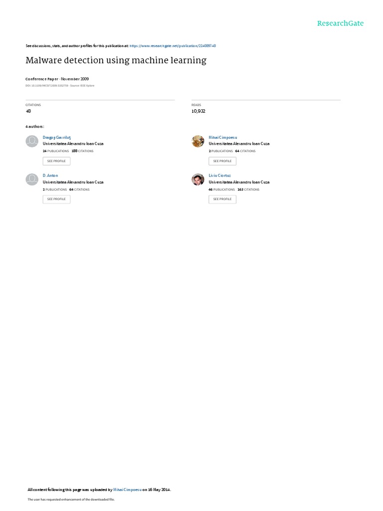 DRAGOŞ GAVRILUŢ ET. AL: MALWARE DETECTION USING MACHINE LEARNING 739