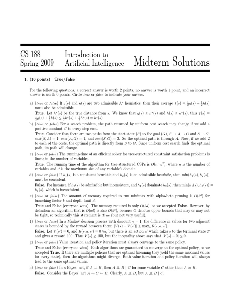 a) (true or false) If g(s) and h(s) are two admissible A∗ heuristics, then their average f (s) = 12 g(s) + 12 h(s)