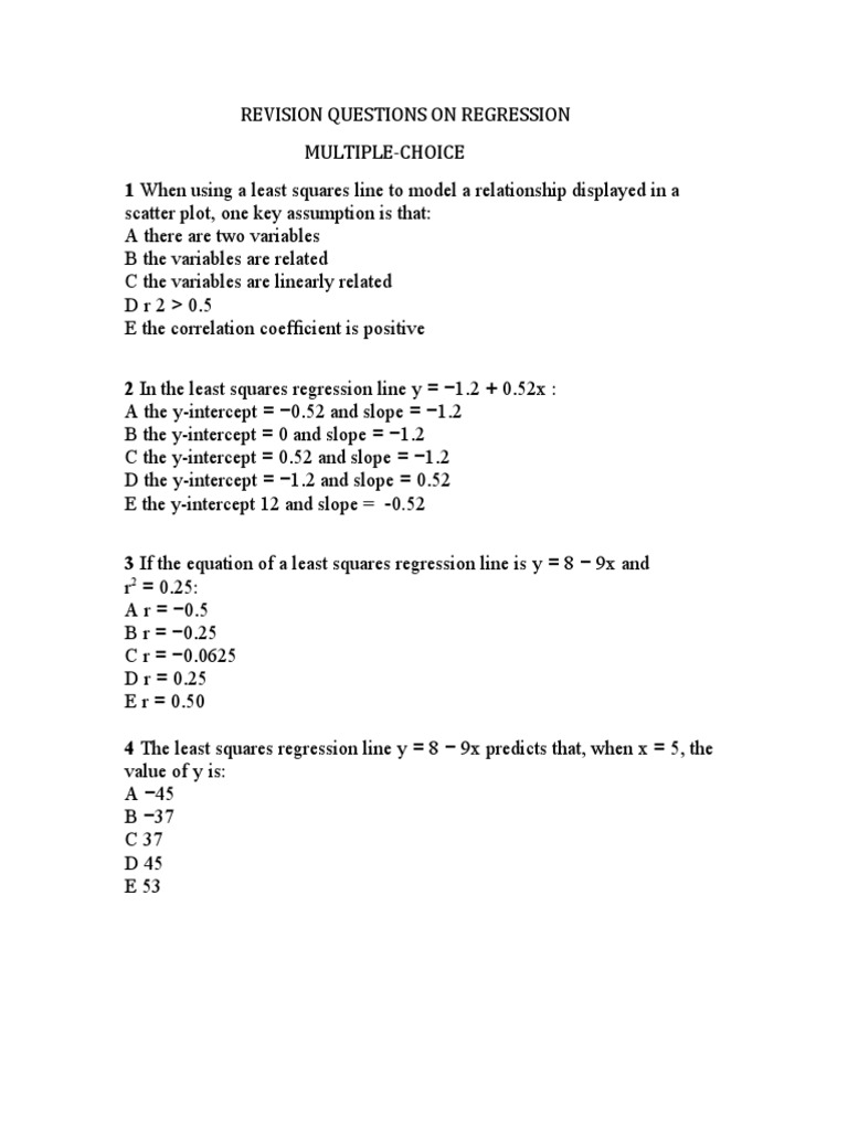 4 The least squares regression line y = 8 − 9x predicts that, when x = 5, the