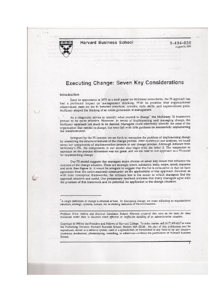 lnnigued by the 7S concept, we set foeth to reexamine the problem of implementing change by identifying the structural features of the change process. After numerous case analyses. we found seven Ieey components of implementation present. in any change process. Although different from McKinsey's 7Ss. the components in our modeJ also begin with the letter S. The temptation to caplta.1.i%e on the popular alliteration was too great. and we too refer to our approach as a 7S model for implementing change.
