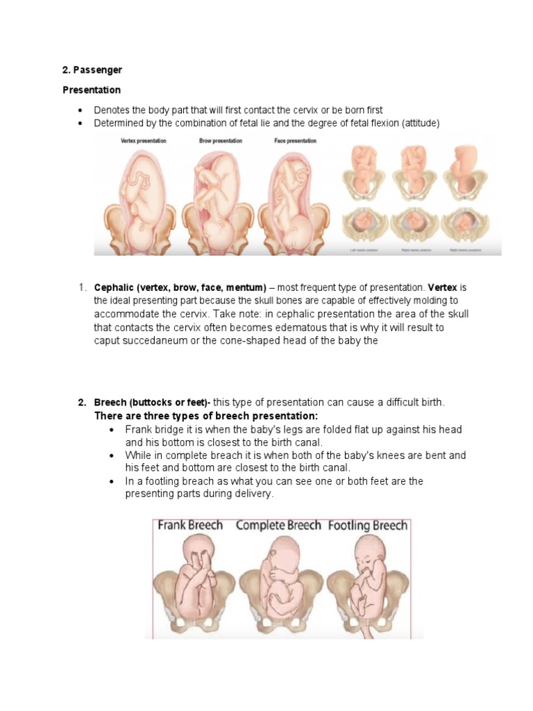 1. Cephalic (vertex, brow, face, mentum) – most frequent type of presentation. Vertex is