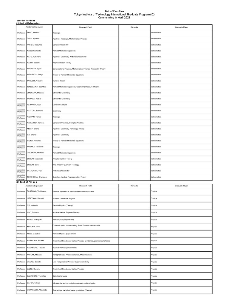 List of Faculties Tokyo Institute of Technology International Graduate Program (C) Commencing in April 2021