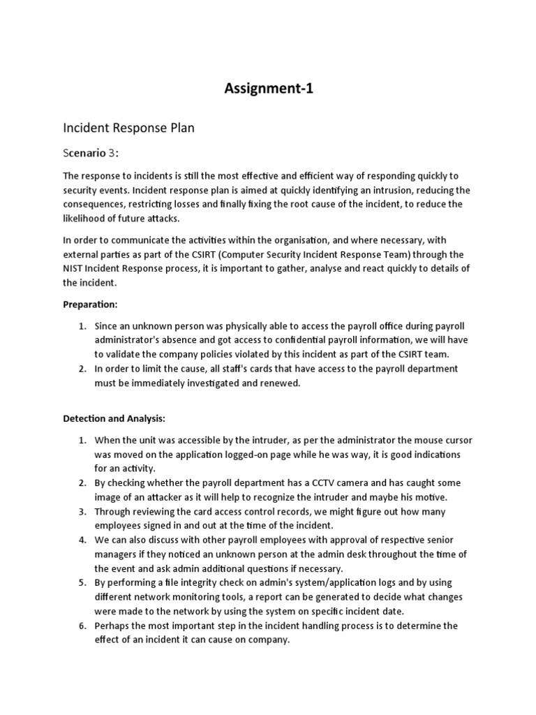 security events. Incident response plan is aimed at quickly identifying an intrusion, reducing the