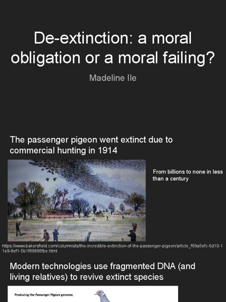 2. Sandler, Ronald. "The Ethics of Reviving Long Extinct Species." Conservation Biology 28, no. 2