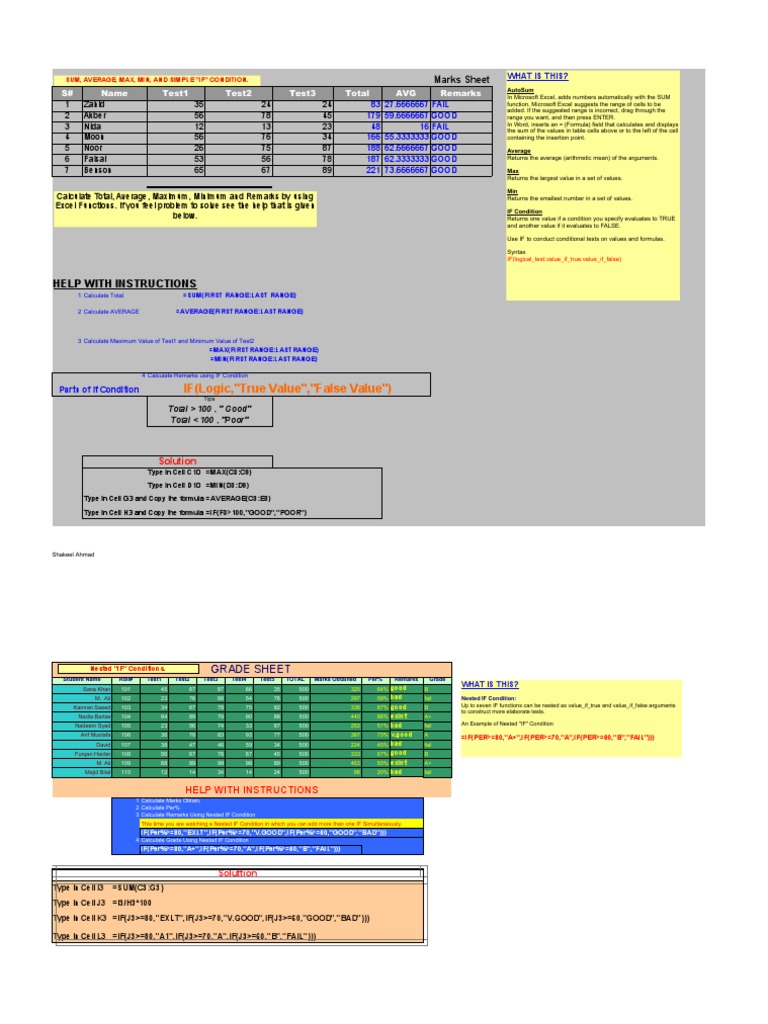 SUM, AVERAGE, MAX, MIN, AND SIMPLE "IF" CONDITION. Marks Sheet