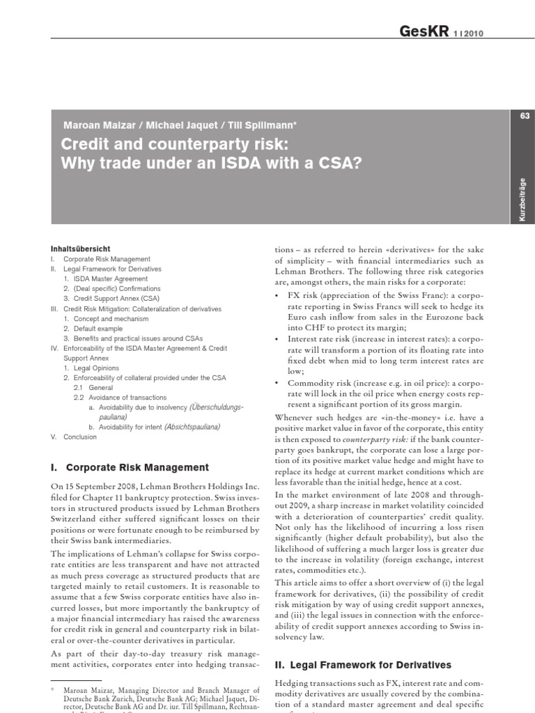 GesKR 1 2010 Maroan Maizar / Michael Jaquet / Till Spillmann – Credit and counterparty risk: Why trade under an ISDA with a CSA?