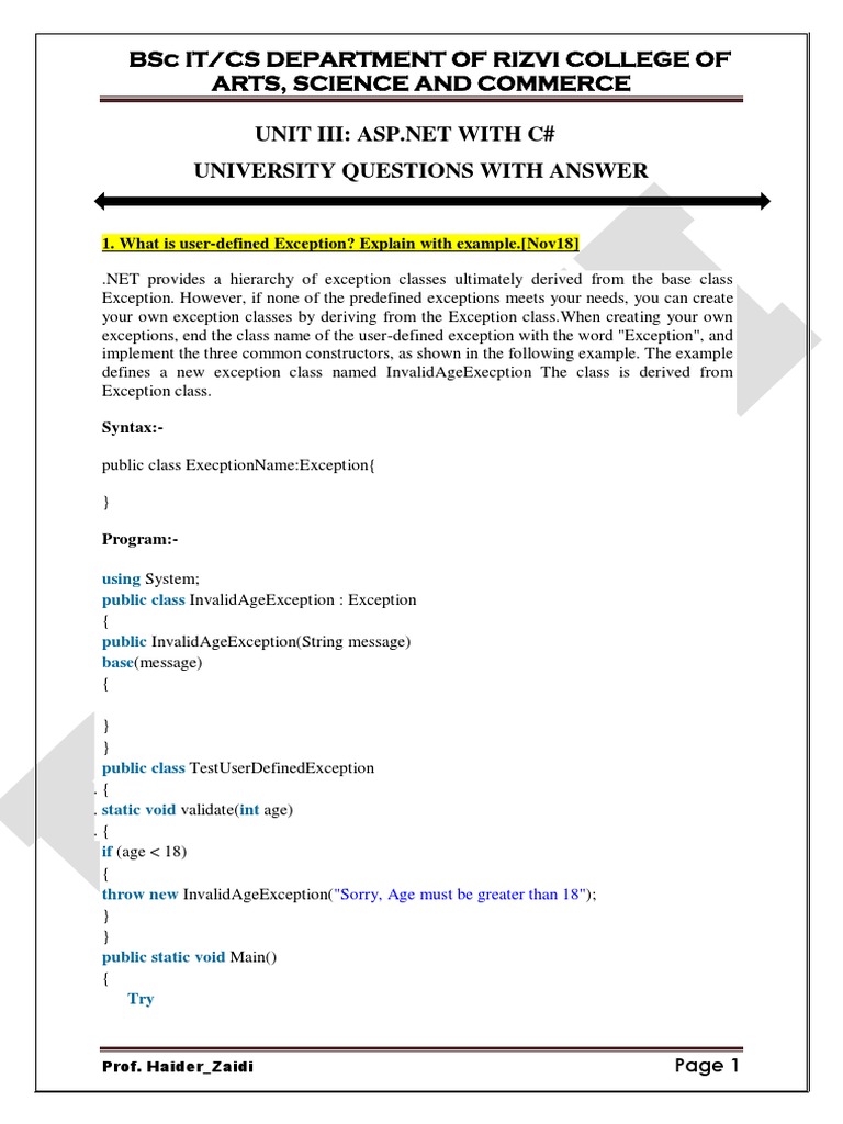 1. What is user-defined Exception? Explain with example.[Nov18]