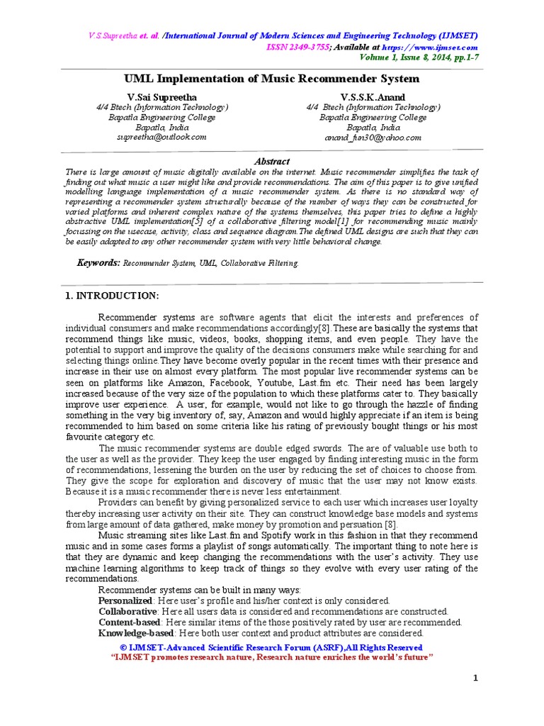 UML Implementation of Music Recommender System: V.Sai Supreetha V.S.S.K.Anand