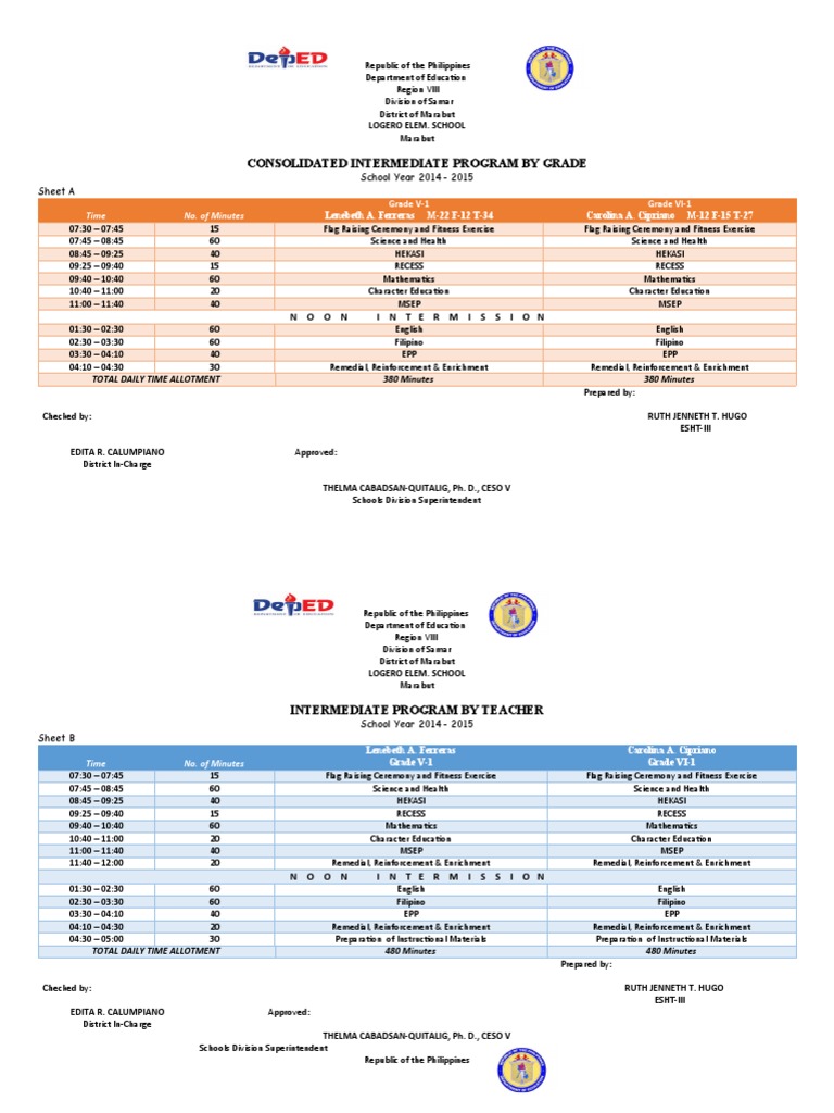 2. Carolina A. VI-1 380 min 1 0 1 0 0 480 min 8 BSEEd 13 yrs Reg/Perm