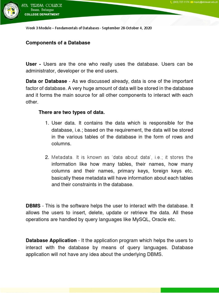Week 3 Module – Fundamentals of Databases - September 28-October 4, 2020
